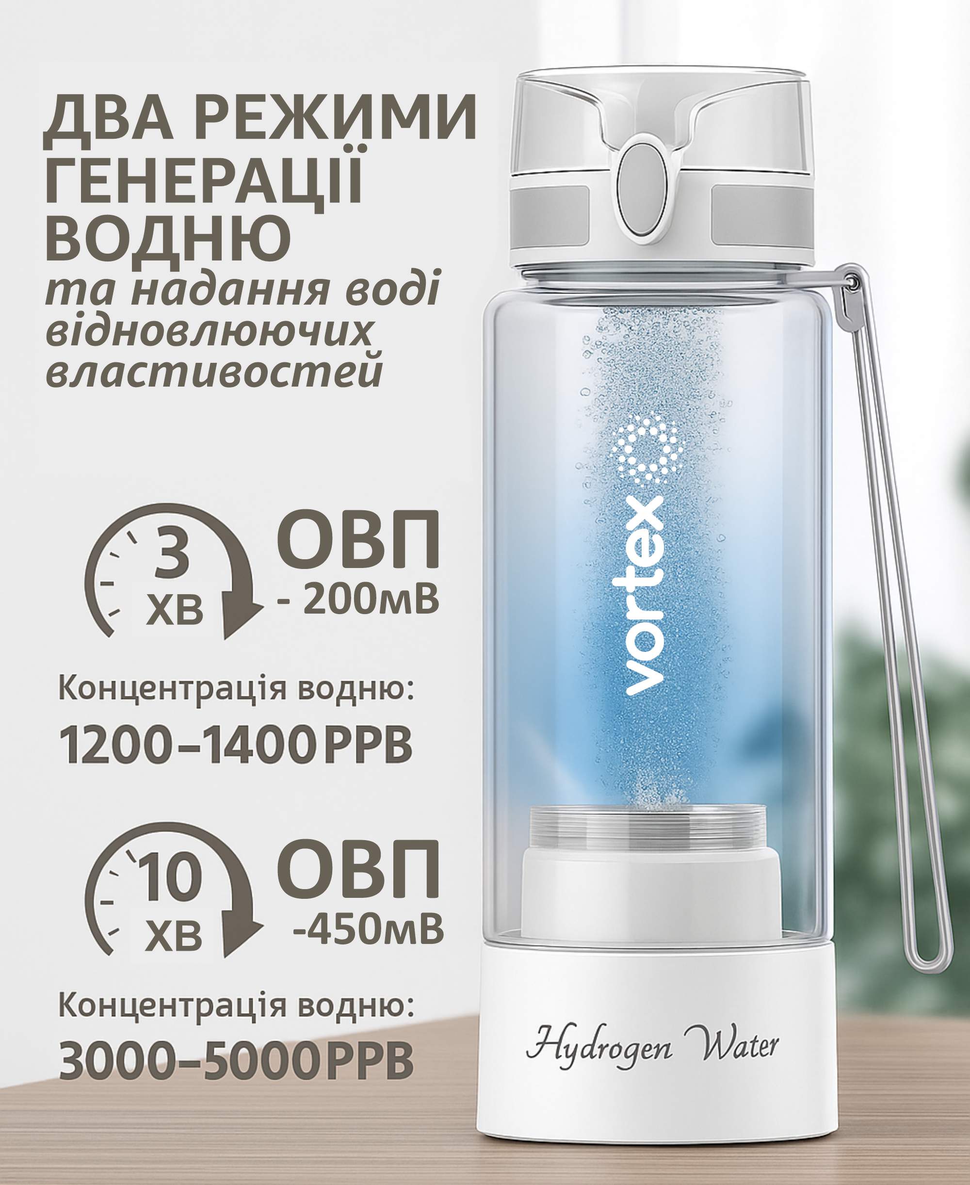 Відкрийте новий рівень гідратації з Vortex — сучасною пляшкою для створення водневої води з від’ємним ОВП до -400 мВ. Завдяки двом режимам роботи ви отримаєте: